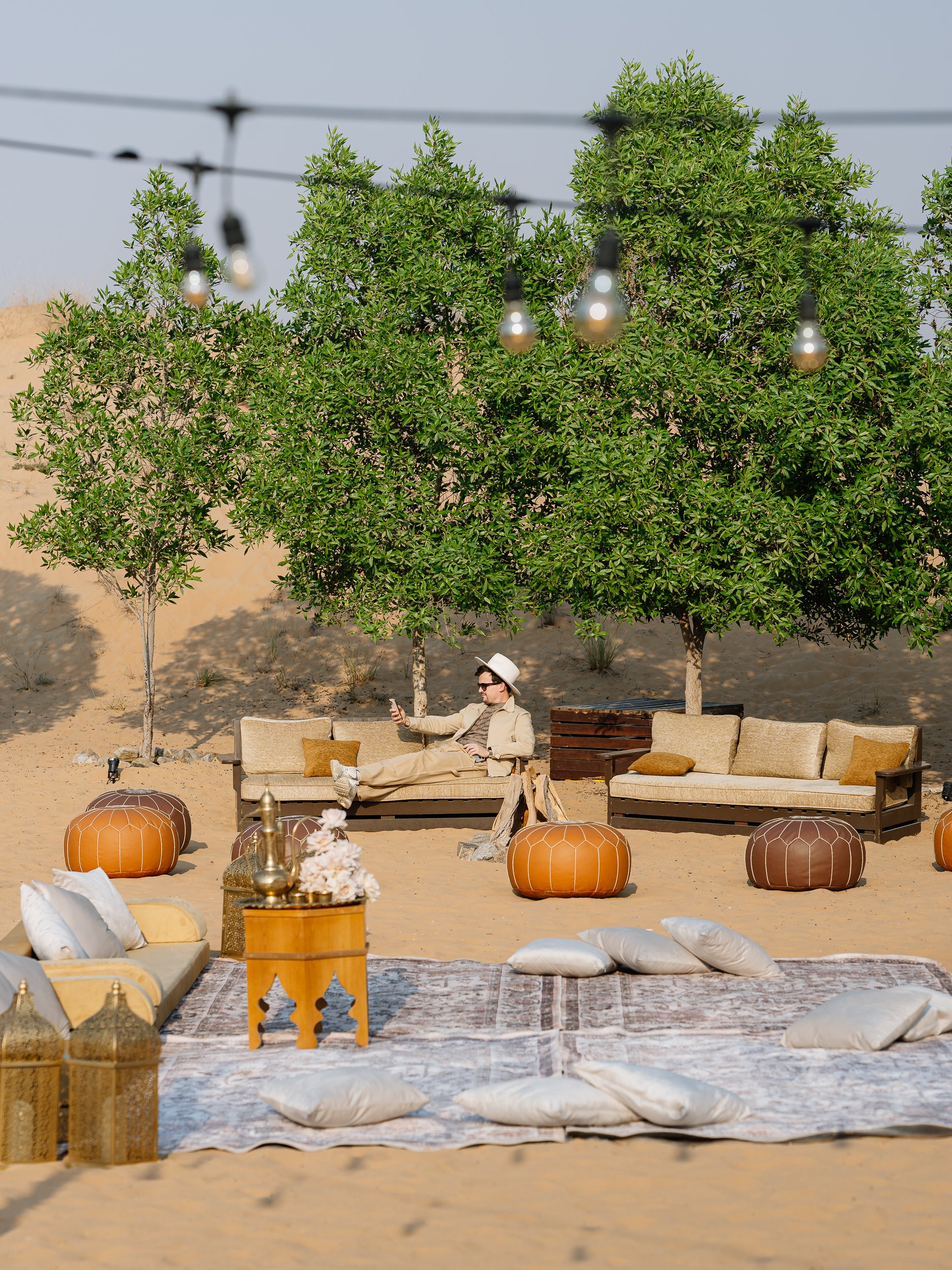 Пространство было обогащено тщательно подобранными восточными элементами — многослойными подушками, фактурными коврами, свечами и фонарями — создавая атмосферу сказочной пустыни, пронизанной сдержанной роскошью. Каждая деталь была продумана до мелочей: от бархатных текстур и едва заметных золотых акцентов до нежных лепестков и мягкого света свечей, благодаря чему каждый уголок казался одновременно захватывающим и непринужденно фотогеничным.