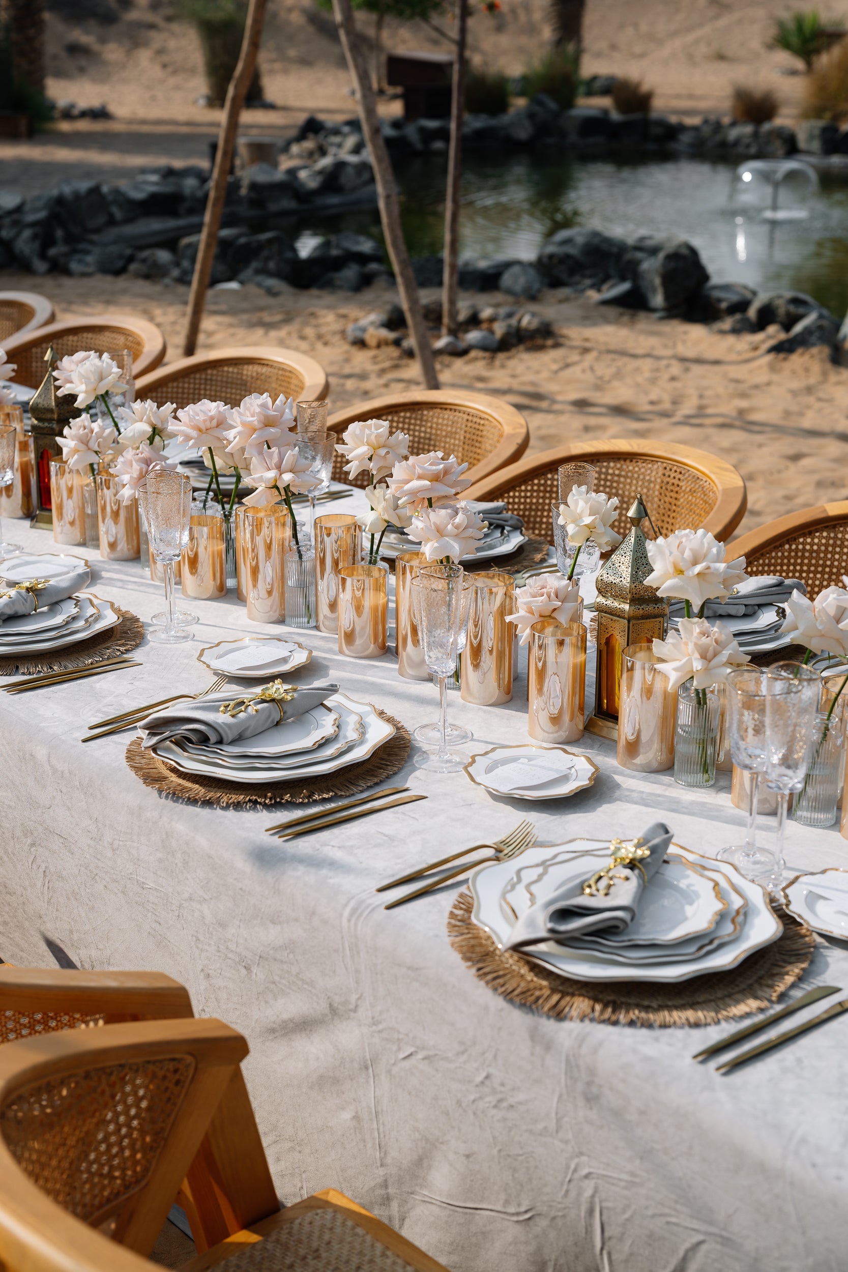 Благодаря гармоничному сочетанию цветочных акцентов, восточных деталей и эксклюзивных декоративных элементов, торжество превратилось в незабываемое событие, наполненное элегантностью, теплотой и тихой магией пустыни.